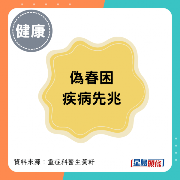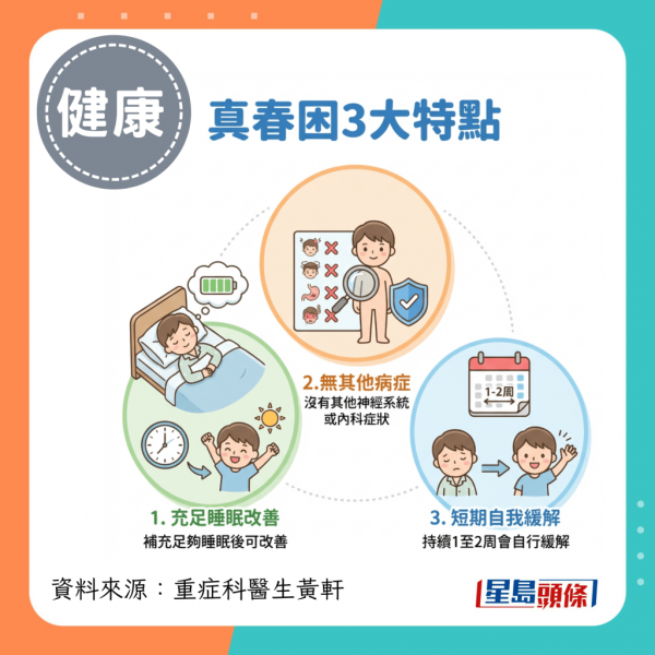 重症科醫生黃軒分享,每到春天,門診總會遇到病人問「最近好睏」是否受春困影響;黃軒醫生指真假春困有分別,睡飽仍疲倦有機會是身體在求救!春季氣溫回升、日照時間延長,人體自律神經需要重新適應這段「生理過渡期」,確實會出現日間容易疲倦、午後精神不振、早晨難以起床的情況。黃軒醫生提醒,「真春困」會有以下特點: