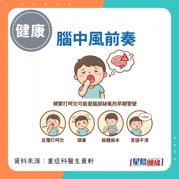 頻繁打呵欠可能是腦部缺氧的早期警號。臨床觀察發現,部分腦血管意外發生前數天,患者會出現:
