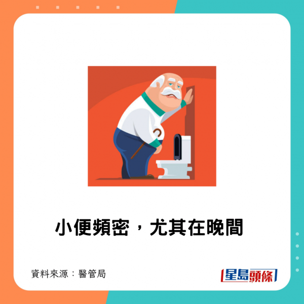 前列腺癌是生長緩慢的癌症,患者體內腫瘤可能存在多年不察覺,而病發初期通常沒有明顯徵狀,據本港醫管局資料顯示,若出現以下一種或多種徵狀,代表著癌腫瘤逐漸增大或已開始轉移: