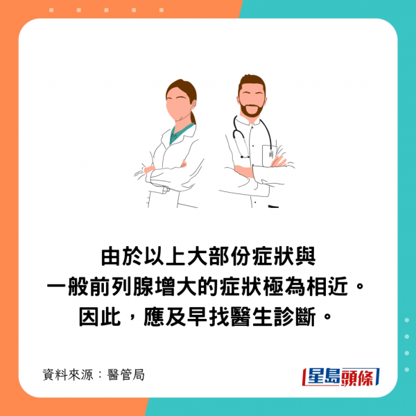 以上症狀與一般前列腺增大的症狀極為相似,因此如出現上述症狀,應及早求醫診斷。此外,如發現盆骨、背部及臀部出現痛楚,顯示病情有機會惡化或腫瘤已擴散至其他部位。