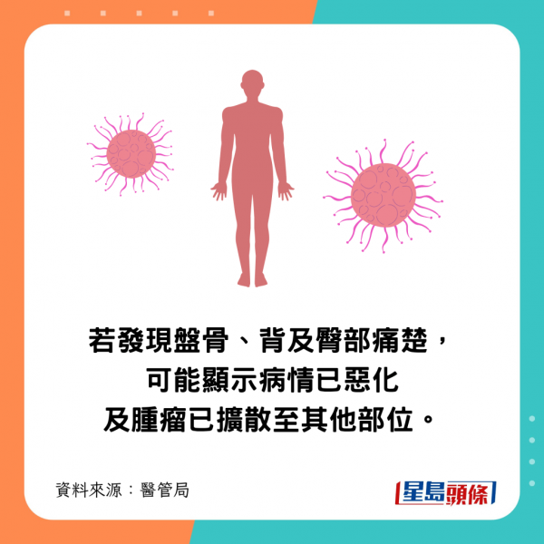 • 疼痛:若癌腫擴散至骨,部份病人會感到較嚴重的疼痛。