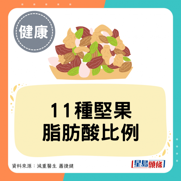 李婉萍營養師指,夏威夷果仁相對熱量最高,只需進食5顆便已達到100大卡,相當於半碗飯的熱量。而黑瓜子則是一眾堅果中性價比最高,要進食166顆才達到100大卡的熱量。