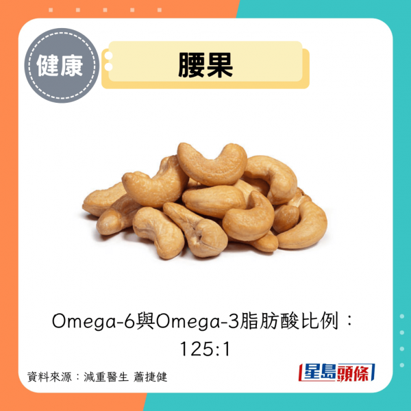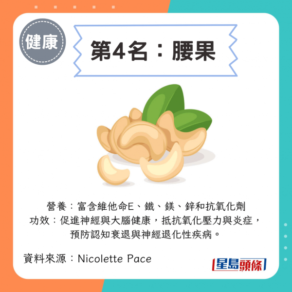 同樣是脂肪含量高及碳水化合物含量低的堅果。1安士約10至12粒,含有不到4g碳水化合物和超過20g健康脂肪,是Lenora Vatamaniuck的第2推介。