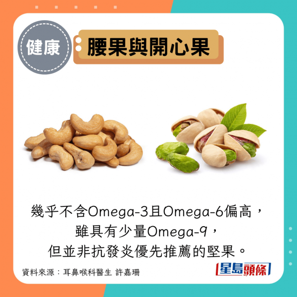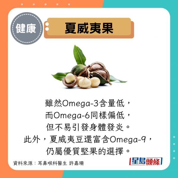 蔡宜方指,在以上列出的堅果中,核桃有高量的ω-3必需脂肪酸,是素食者的ω-3脂肪酸來源之一,能支持腦部健康!其他堅果類中也有不同比例的巨量及微量營養素,多元攝取能帶給身體不同的好處。她建議,大家可以挑選沒有添加調味料的原味無鹽堅果,更能體會堅果本來的味道,亦對身體更健康。