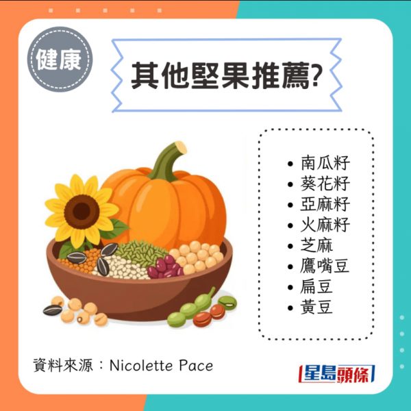 Pace建議每日適量進食,可攝取28g至42g(約150-200卡路里)堅果以達最佳健康效益。以下堅果也屬於健康的選擇: