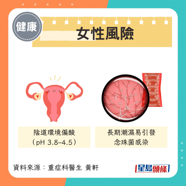 • 陰道環境偏酸(pH 3.8–4.5) • 長期潮濕易引發念珠菌感染 |