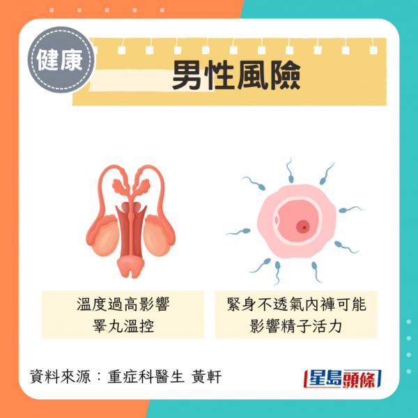 • 溫度過高影響睪丸溫控 • 緊身不透氣內褲可能影響精子活力 |