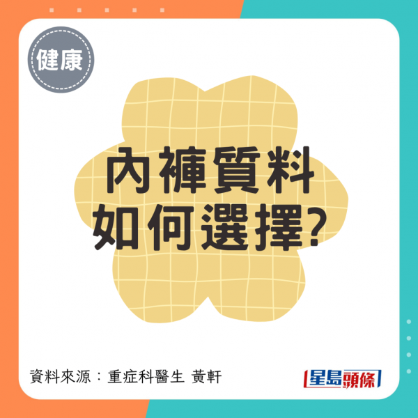 黃醫生提醒,內褲要每天換、3–6個月汰舊換新,不要穿到破才換;清洗時要用60°C以上熱水,再由陽光暴曬,才可有效殺菌。內褲質料選擇重點: