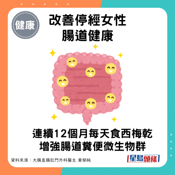 2022年一項在《Food Funct》發表的研究報告指出,西梅可改善女性停經後的腸道健康和增強當中的微生物群,如果連續12個月每天食用西梅乾,對女性停經後的腸道糞便微生物群似乎可產生持續有益的影響,特別是增加毛螺菌科細菌的豐富度。毛螺菌科不僅能產生短鏈脂肪酸SCFA,還與酚類代謝和免疫調節有關,能減少腸道發炎因子。
