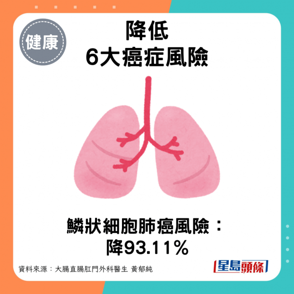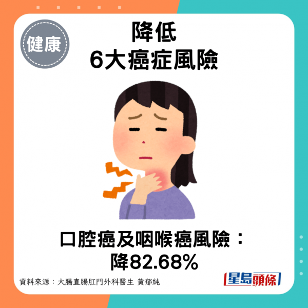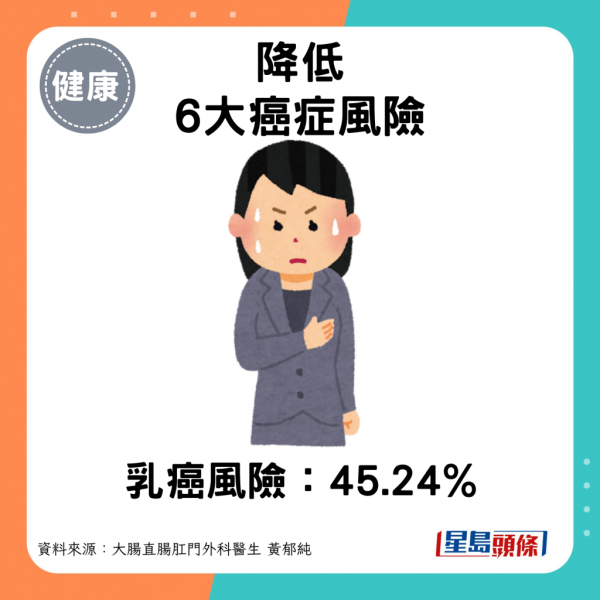 黃郁純醫生引述一項研究指,進食西梅乾等果乾可以降低患癌風險。西梅乾這些果乾,攝取量每增加一個標準差,6種癌症的發病率,下降的程度也不同。其中一種癌症的發病率,更可減97.26%。