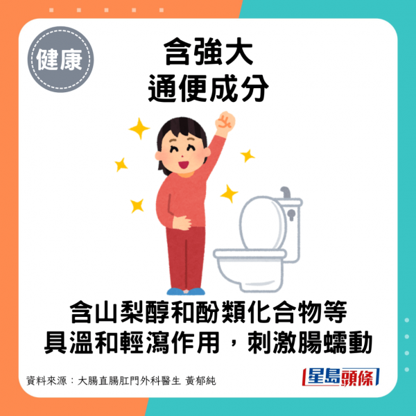 - 含有天然山梨醇和酚類化合物等成分:有溫和的輕瀉作用,有助刺激腸蠕動,並緩解消化不適。