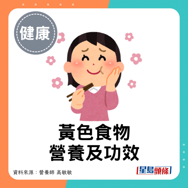 營養師高敏敏在其Facebook專頁發文指,不同顏色的蔬果中所含有的植化素,是植物為防禦而演化的天然物質,對人體有不同的健康好處。其中,彩虹食物中的黃色食物,有助抗衰老、抗自由基。