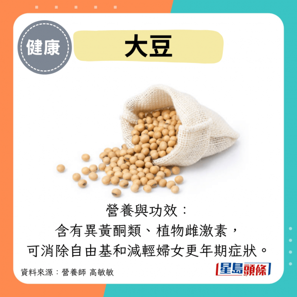 - 含有異黃酮類、植物雌激素,可消除自由基和減輕婦女更年期症狀。