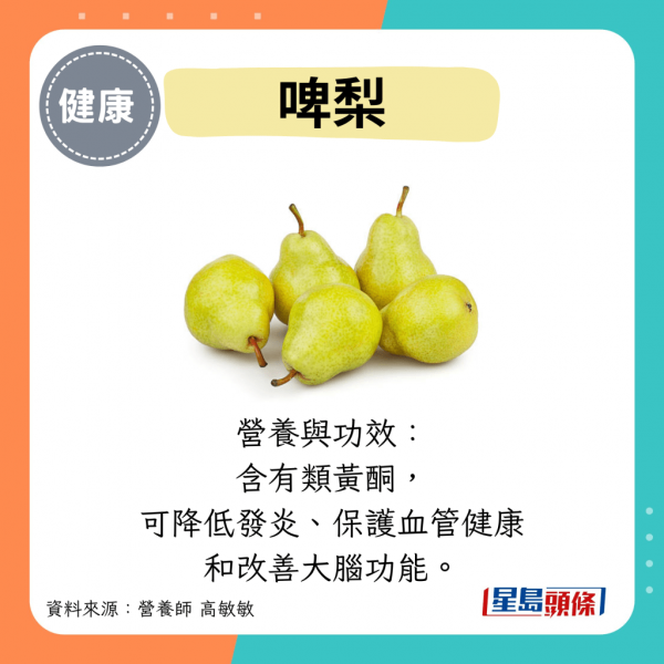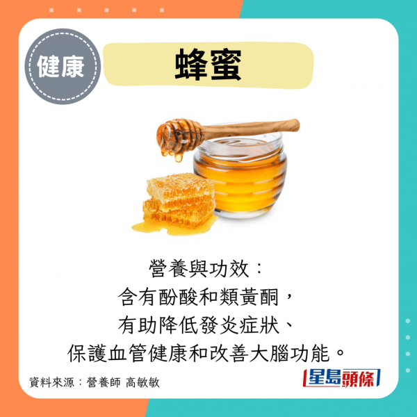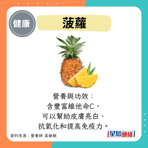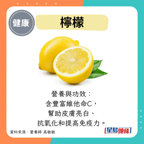 她列出18種營養豐富的黃色食物,其中,含有類黃酮,可增強免疫力、抗癌和抗發炎;也含有維他命C,有助對抗氧化,亦是幫助製造膠原蛋白、皮膚淡斑亮白的關鍵營養素,建議大家多吃。