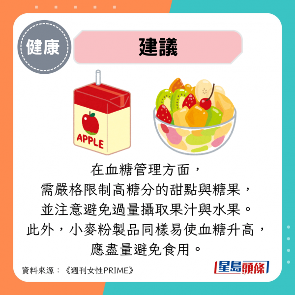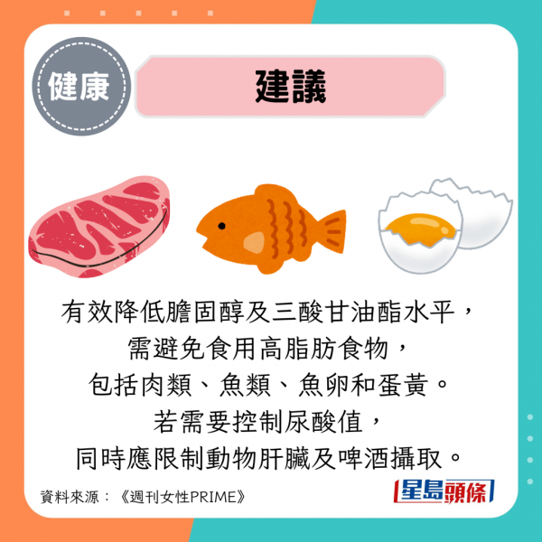 為有效降低膽固醇及三酸甘油脂水平,需避免食用高脂肪食物,包括肉類、魚類、魚卵和蛋黃。若需要控制尿酸值,同時應限制動物肝臟及高嘌呤的啤酒攝取。在血糖管理方面,需嚴格限制高糖分的甜點與糖果,並注意避免過量攝取果汁與水果,因果汁中的糖分會被人體迅速吸收導致血糖急升。此外,小麥粉製品同樣易使血糖升高,應盡量避免食用。
