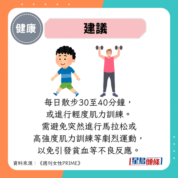 規律運動能有效調節血壓與血糖水平,促進優質血液生成,建議每日散步30至40分鐘,或進行輕度肌力訓練。避免貿然進行馬拉松、高強度肌力訓練等劇烈運動,以免引發貧血等不良反應。
