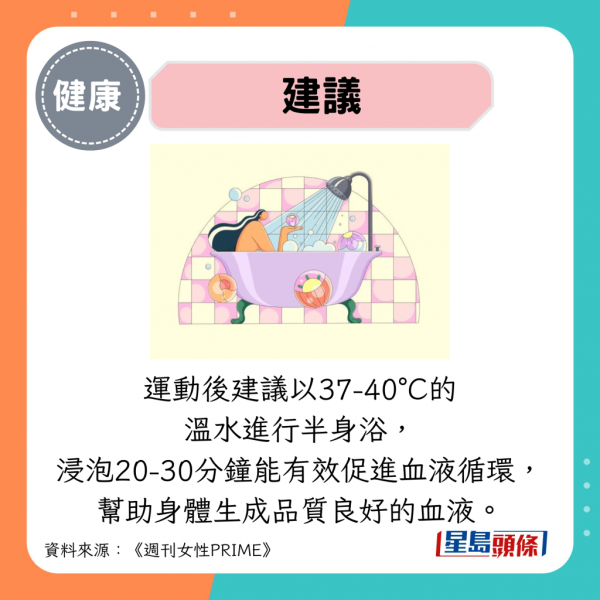 運動後建議以37-40°C的溫水進行半身浴,浸泡20-30分鐘能有效促進血液循環,幫助身體生成品質良好的血液。