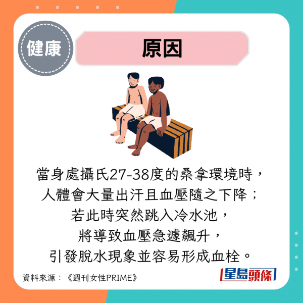 許多人誤以為焗桑拿能改善血液循環並幫助減肥,但實際上存在極高危險性。當身處攝氏27-38度的桑拿環境時,人體會大量出汗且血壓隨之下降;若此時突然跳入冷水池,將導致血壓急遽飆升,引發脫水現象並容易形成血栓。雖然年輕族群可能較能承受如此劇烈變化,但對中老年人而言極具危險性,務必適度進行。