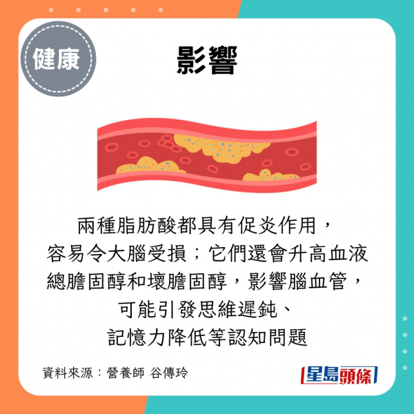 李思賢醫生指,常見的Omega-6脂肪酸「亞油酸」(Linoleic acid, LA),在人體內可轉化為其他生物活性物質,例如「花生四烯酸」(Arachidonic acid, AA),參與炎症反應和維持細胞膜結構等生理功能。