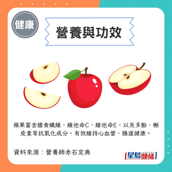 營養師顏瑜萱曾撰文講解蘋果的營養,並推介最佳食法。她表示,蘋果被認為可以預防感冒、提升免疫力,並紓緩一些不適症狀,箇中原因是當中的1種關鍵成分——榭皮素。這是一種水溶性的黃酮類植化素,具有3大活性及作用: