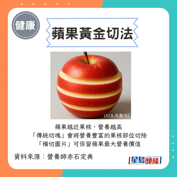 東京慈惠會醫科大學附屬醫院的管理營養師赤石定典指,蘋果富含膳食纖維、維他命C、維他命E,以及多酚、槲皮素等抗氧化成分,有效維持心血管、腸道健康。他提出,只要改變蘋果「傳統切塊」方式,由縱切改為「橫切圓片」,能讓維他命E攝取量提升4倍,鈣質吸收更有2倍增長。赤石定典指出: