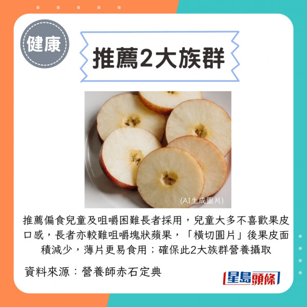 蘋果以「橫切圓片」方式切開,只會去除中心小果核,和其他切法相比,減少浪費果肉,將營養最大化保留。赤石定典特別推薦偏食兒童及咀嚼困難長者採用,兒童大多不喜歡蘋果皮口感,長者亦較難咀嚼塊狀蘋果,「橫切圓片」後果皮面積減少,薄薄一片更易食用;確保此2大族群營養攝取。