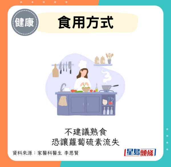 對於蘿蔔硫素的功效,李思賢醫生曾分享指,西蘭花芽等十字花科蔬菜,含有的蘿蔔硫素不僅可降患心血管病風險,更具抗癌功效。剛發芽的十字花科蔬菜,其蘿蔔硫素含量更可達熟植株的20倍以上。