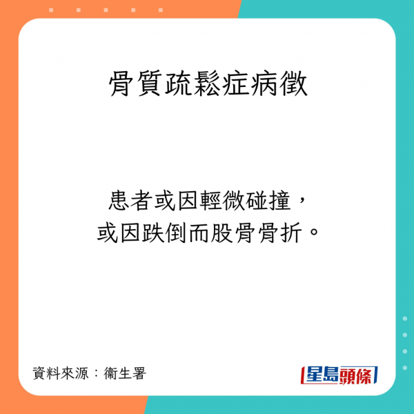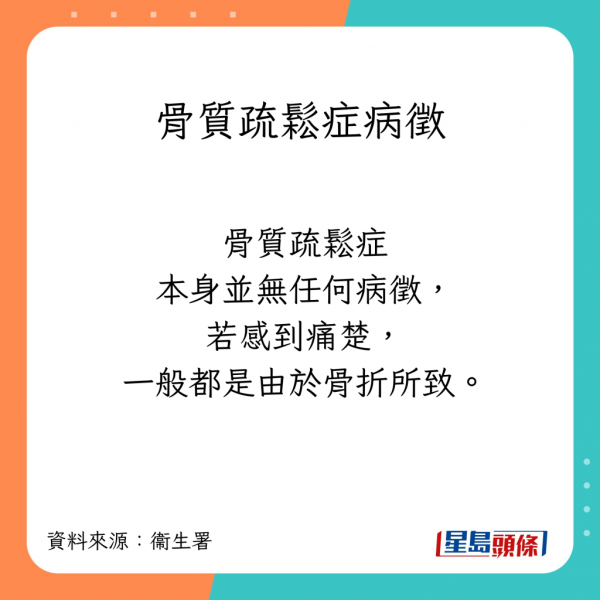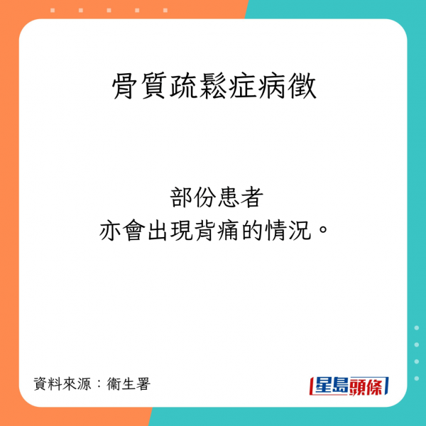 據香港衞生署資料顯示,骨質疏鬆症本身並沒有任何明顯病徵。部份患者可能會出現背痛的情況,大多數患者未必能於早期發現,很多時候直到發生骨折後才會發現患上骨質疏鬆症。患者可能會出現以下症狀: