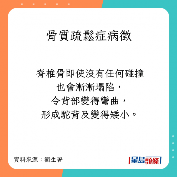 - 骨質疏鬆症的患者亦可能因為脊椎骨塌陷,令背部變得彎曲,導致駝背和變矮