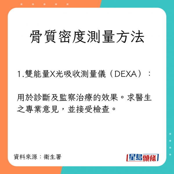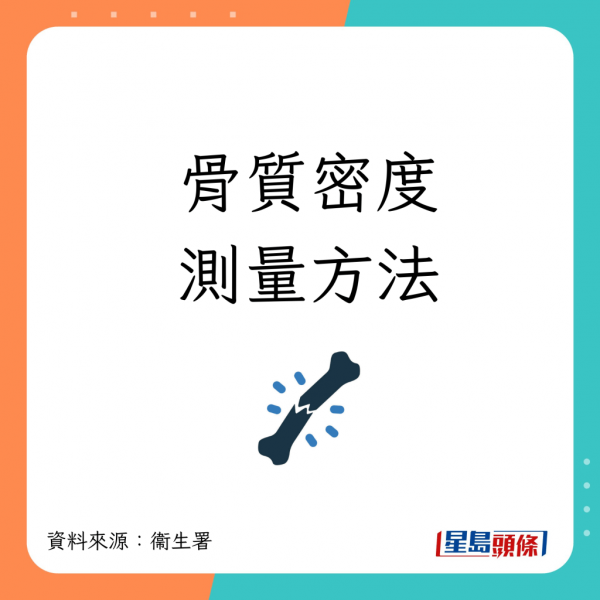 如屬上述高危人士,可尋求醫生之專業意見,並接受檢查。常見測量骨質密度的 方法有: