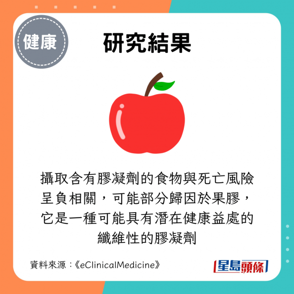 - 攝取含有膠凝劑的食物與死亡風險呈負相關,可能部分歸因於果膠的使用,它是一種可能具有潛在健康益處的纖維性的膠凝劑。