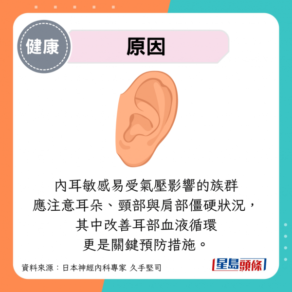內耳敏感易受氣壓影響的族群應特別注意耳朵、頸部與肩部的僵硬狀況,其中改善耳部血液循環更是關鍵預防措施。除了可用熱毛巾熱敷雙耳、外出時配戴帽加強防護外,亦可透過下列耳部拉伸動作促進循環,需注意避免過度用力造成疼痛,動作如下: