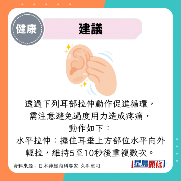 - 水平拉伸:握住耳垂上方部位水平向外輕拉,維持5至10秒後重複數次。