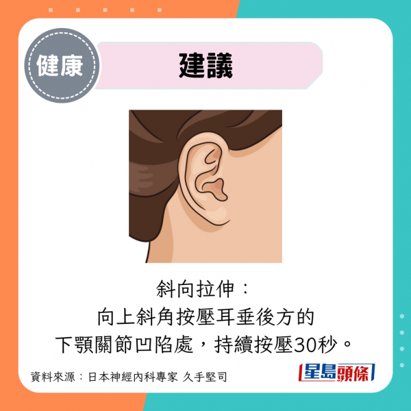 - 斜向拉伸:向上斜角按壓耳垂後方的下顎關節凹陷處,持續按壓30秒。