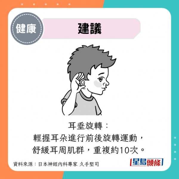 - 耳垂旋轉:輕握耳朵進行前後旋轉運動,舒緩耳周肌群,重複約10次。