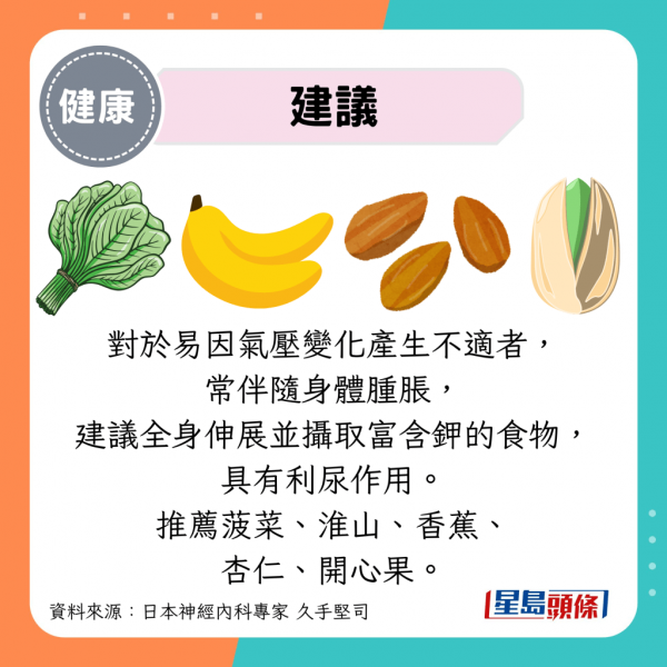 對於易因氣壓變化產生不適者,常伴隨身體腫脹,建議應進行全身伸展並攝取富含鉀的食物,具有利尿作用。推薦選擇菠菜、淮山、香蕉、杏仁、開心果等。