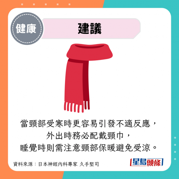 由於溫差會具體表現為冷熱感受,最簡易的應對策略即透過衣著調節體感溫度。但當頸部受寒時更容易引發不適反應,外出時務必配戴頸巾,睡覺時則需注意頸部保暖避免受涼。