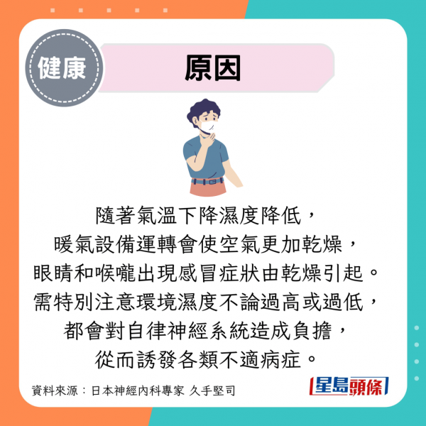 隨著氣溫下降濕度降低,加上暖氣設備運轉會使空氣更加乾燥,眼睛和喉嚨出現類似感冒的症狀通常是由乾燥引起。因此,需特別注意環境濕度不論過高或過低,都會對自律神經系統造成負擔,從而誘發各類不適病症。