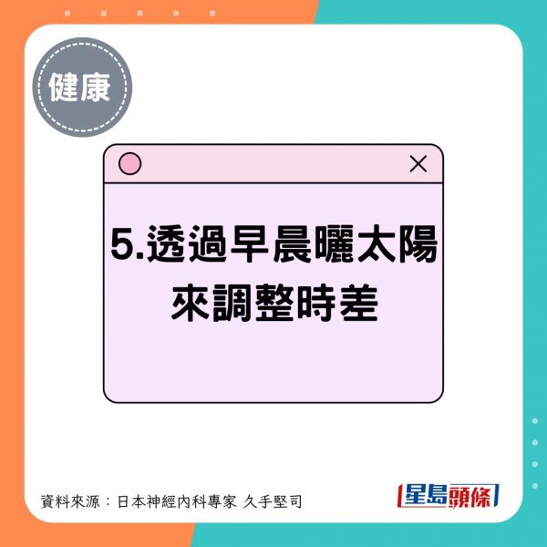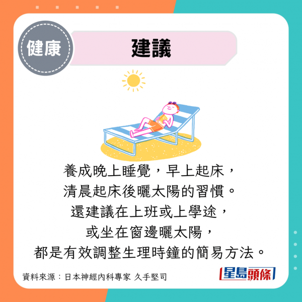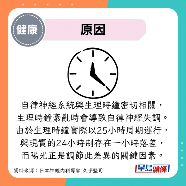 自律神經系統與人體生理時鐘密切相關,當生理時鐘紊亂時會直接導致自律神經失調。由於人體生理時鐘實際以25小時為周期運行,與現實的24小時制存在一小時落差,而陽光正是調節此差異的關鍵因素。建議養成晚上睡覺,早上起床,清晨起床後曬太陽的習慣。還建議在上班或上學途,或坐在窗邊曬太陽,都是有效調整生理時鐘的簡易方法。