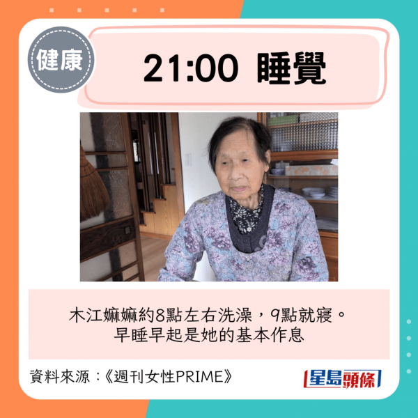 木江婆婆約8點左右洗澡,9點就寢。早睡早起是她的基本作息。