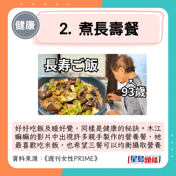 好好吃飯及睡好覺,同樣是健康的秘訣。木江婆婆的YouTube影片中出現了許多親手製作的營養餐,她最喜歡吃米飯,也注重三餐均衡攝取營養。